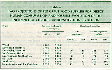 2.28 Projections by FAO for food supplies by region suggest that future food problems will be concentrated in sub-Saharan Africa and South Asia. Availabilities in all other regions are projected to be adequate by the year 2010, as agricultural production growth is expected to keep pace with growing food requirements. The FAO projections, shown in Table 6, estimate an average daily per caput food-energy supply of 2 730 Calories in developing countries in the year 2010 (FAO, 1995c). In these countries, chronic undernutrition is expected to affect 11 percent of the population, or 637 million people. These global figures conceal important regional differences. In three regions (the Near East and North Africa, East Asia and Latin America and the Caribbean) food-energy supply is projected at about 3 000 Calories per day. The prevalence of chronic undernutrition is expected to be between 4 and 6 percent of the population. South Asia (2 450 Calories/caput/day) and especially sub-Saharan Africa (2 170 Calories/caput/day) are expected to be the regions with the lowest per caput food-energy supplies by the year 2010.