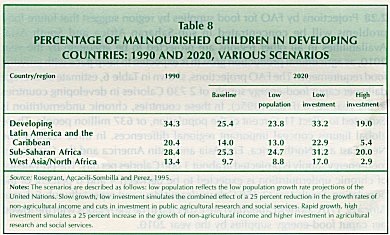2.29 The future food and nutrition situation is by no means an immutable fate, but a function of the actions taken in the meantime. This becomes readily apparent when food availability consequences are derived from alternative scenarios involving different population and investment policies. Results of such scenarios prepared by the International Food Policy Research Institute (IFPRI) regarding projected food availability and malnutrition among preschool children are shown in Tables 7 and 8. According to a baseline scenario, food availability will increase in all developing regions except sub-Saharan Africa. Greater food availability may result in a declining proportion of underweight children. This highlights the critical importance of investment in sustainable agricultural productivity, an issue addressed further below. Also, a positive effect in the form of a reduction in population growth would become apparent within a 25-year horizon (Rosegrant, Agcaoili-Sombilla and Perez, 1995).