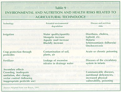 3.10 Apart from the consumption effects, however, knowledge of the nutrition and health linkages of agricultural technology is incomplete. Nutritional concerns include indirect income and employment effects on consumption (for example, when the poor are bypassed by agricultural technology) and effects of technology on health. Water-borne diseases and pesticides are predominant among the health concerns associated with the technology package that combines water control, seeds, plant nutrition and plant protection (see Table 9).