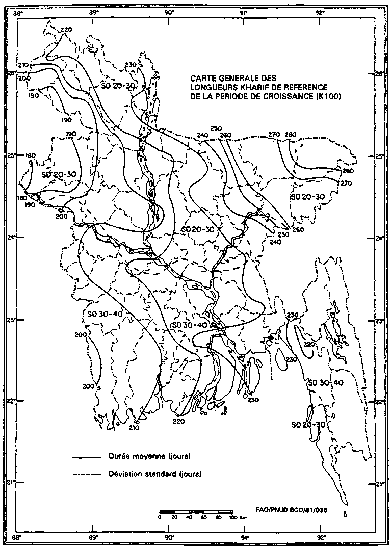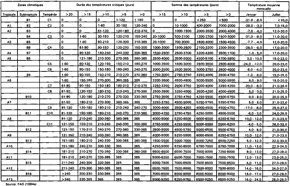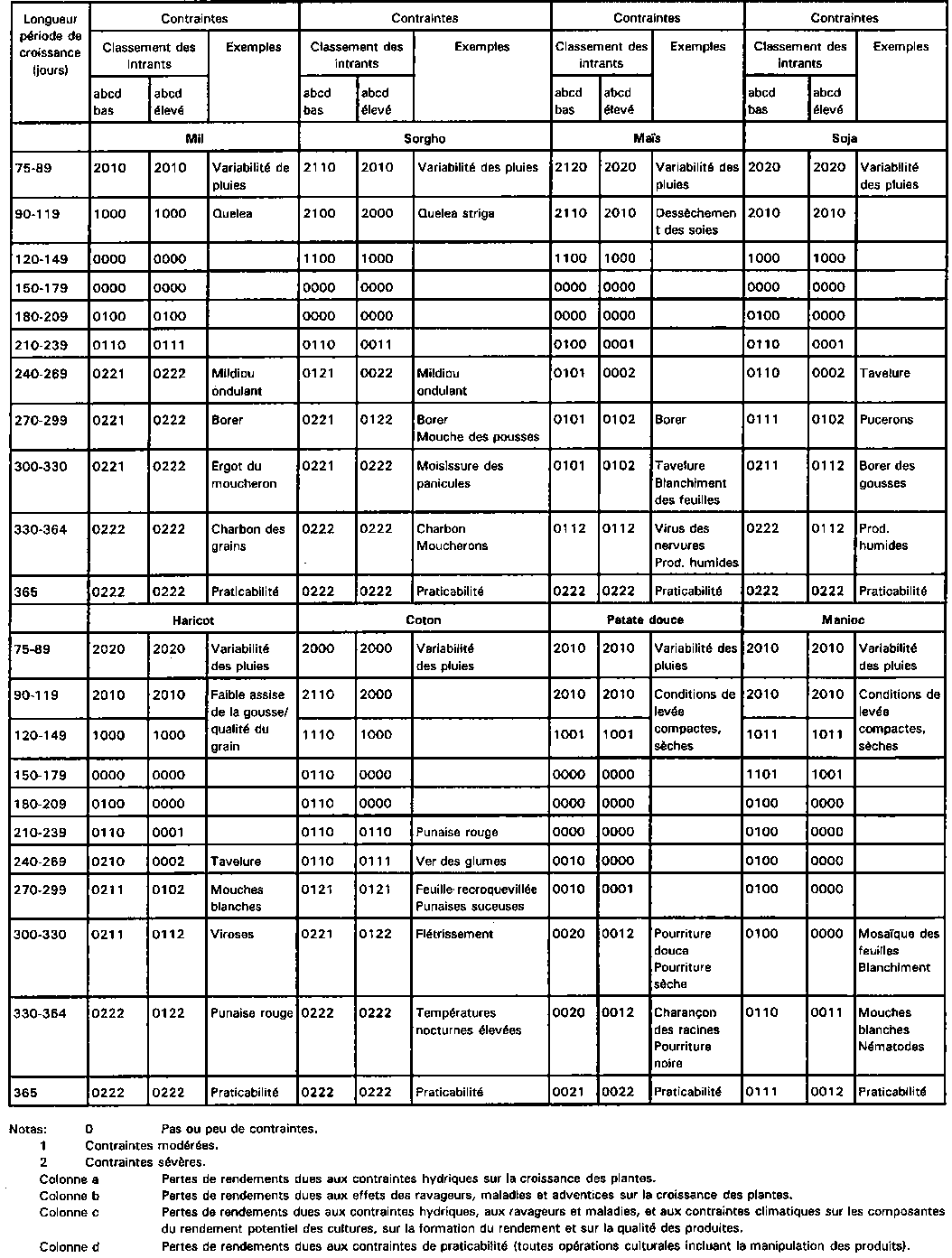 Un exemple des paramètres des cultures nécessaires à la détermination de l'aptitude climatique est donné au tableau 5. Les exigences en longueur de jour devraient aussi être normalement incluses, mais les cultivars considérés dans ce cas particulier sont tous insensibles à la longueur du jour. Des informations similaires portant sur d'autres cultures sont données dans les travaux de la FAO (1978) et de Kassam (1980).