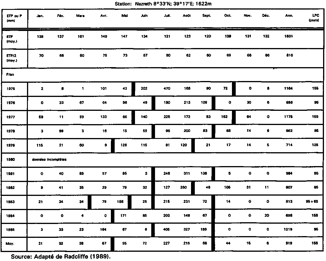 Un exemple des paramètres des cultures nécessaires à la détermination de l'aptitude climatique est donné au tableau 5. Les exigences en longueur de jour devraient aussi être normalement incluses, mais les cultivars considérés dans ce cas particulier sont tous insensibles à la longueur du jour. Des informations similaires portant sur d'autres cultures sont données dans les travaux de la FAO (1978) et de Kassam (1980).