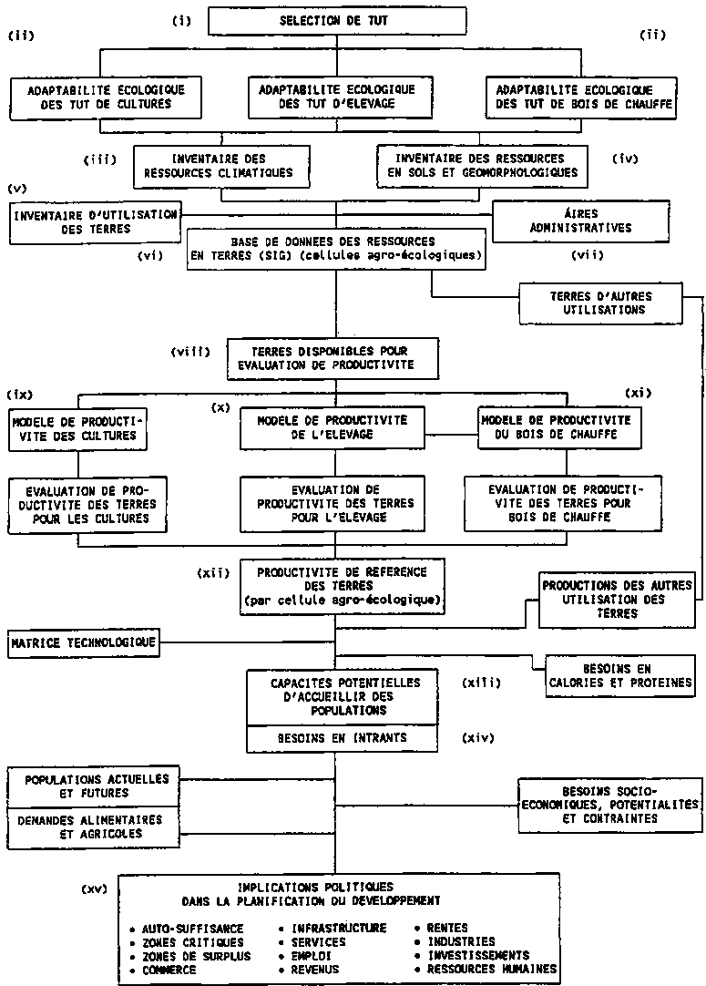 · l'inventaire des types d'utilisation des terres et de leurs exigences écologiques;· la définition et la cartographie des zones agro-écologiques basées sur les inventaires des ressources en terres (incluant le climat, la géomorphologie et les sols);