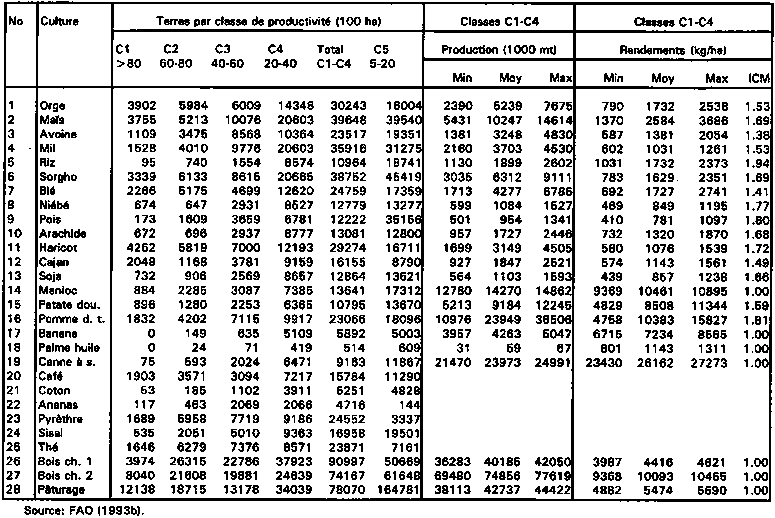 Six classes d'aptitude ont été définies; à l'intérieur d'une cellule, elles résultent de la corrélation entre l'aptitude moyenne d'une culture pure et les rendements maxima possibles. Les classes C1 à C5 se rapportent à des rendements s'élevant à > 80%, 60-80%, 40-60%, 20-40% et 5-20% des rendements agro-climatiques maxima. Il est à noter que les superficies dans la classe d'aptitude C5 ne sont généralement pas prise en compte dans les options de cultures viables; par contre, elles ont été reprises dans ce tableau comme indication des perspectives de production de zones très marginales. Une sixième classe d'aptitude regroupe les régions qui sont totalement inaptes ou qui ne permettent que <5% du rendement maximum possible. Les données de cette classe d'inaptitude ne sont pas incluses dans le tableau des résultats.