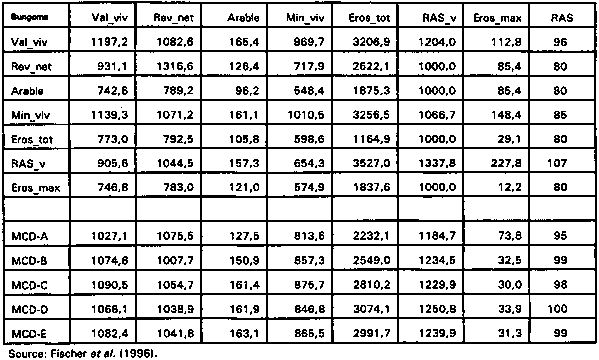Les résultats de l'analyse d'échantillons du district de Bungoma sont présentés au tableau 22. Les sept premières colonnes du tableau contiennent les valeurs des critères obtenues après que chaque critère ait été optimalisé par des opérations successives d'optimalisation à critère unique. Les éléments montrés dans la diagonale de la matrice représentent l'Utopie, ou les 'meilleures' valeurs pour les sept critères (ex. 1197.2, 1316.6, 96.2, 1010.5, 1164.9, 1338.8, 12.2). Le Nadir ou 'pires' valeurs se retrouvent en prenant les valeurs les plus basses dans les colonnes des critères à maximaliser (ex. Val_viv = 742.6, Rev_net = 783.0, Min_viv = 548.4, RAS_v = 1000.0) ainsi que les valeurs les plus élevées, dans les colonnes, des critères à minimiser (ex. Arable = 165.4, Eros_tot = 3527.0, Eros_max = 227.8).