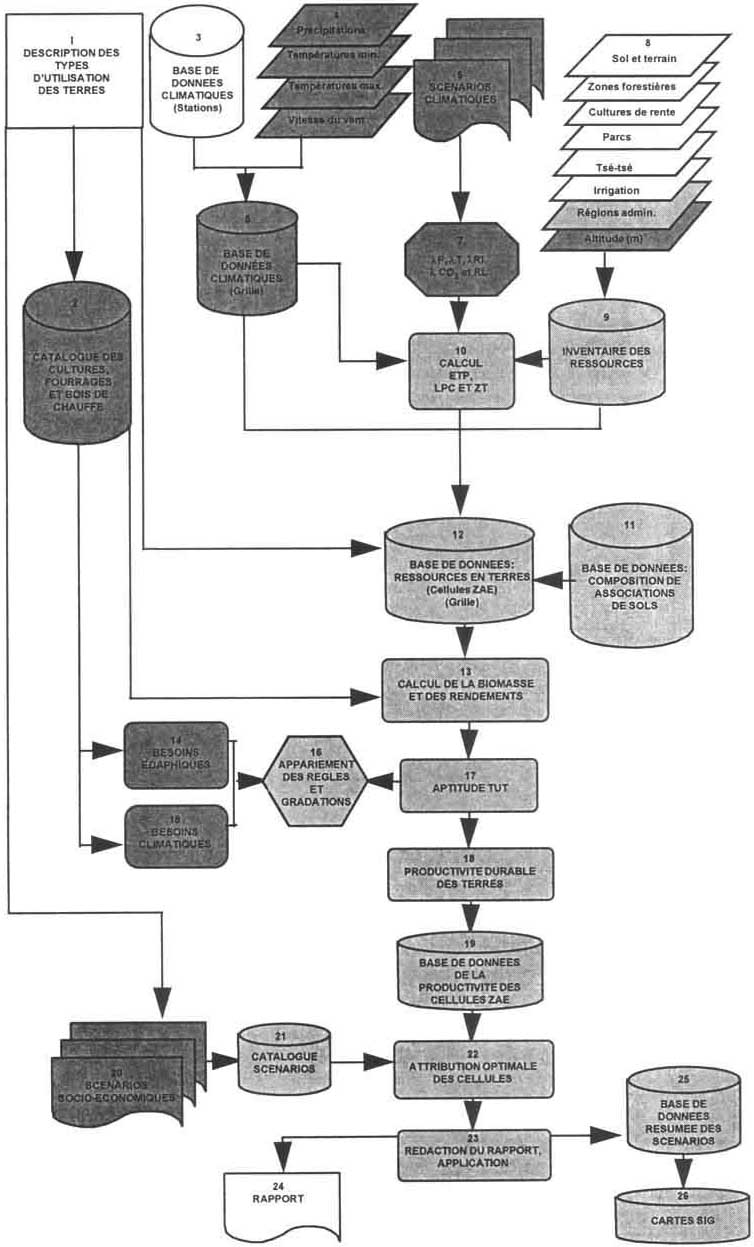 Les ZAE impliquent l'enchaînement de nombreuses procédures logiques pour arriver à une estimation quantitative d'un rendement ou d'une production pour une zone ou une cellule agro-écologique donnée. Ce type de méthodologie est particulièrement approprié à l'informatique, et, vu les quantités impressionnantes de données à traiter, de gros ordinateurs ont été utilisés dès les premières études FAO à échelle continentale (FAO, 1978). Ensuite, la méthodologie s'est adaptée à l'apparition des mini puis des micro-ordinateurs, plus récemment. La plupart des recherches ZAE de pointe intègrent une série de bases de données, liées à un SIG et à des modèles informatiques conçus à cet effet, et qui permettent de multiples applications en gestion des ressources naturelles et en planification de l'utilisation des terres.