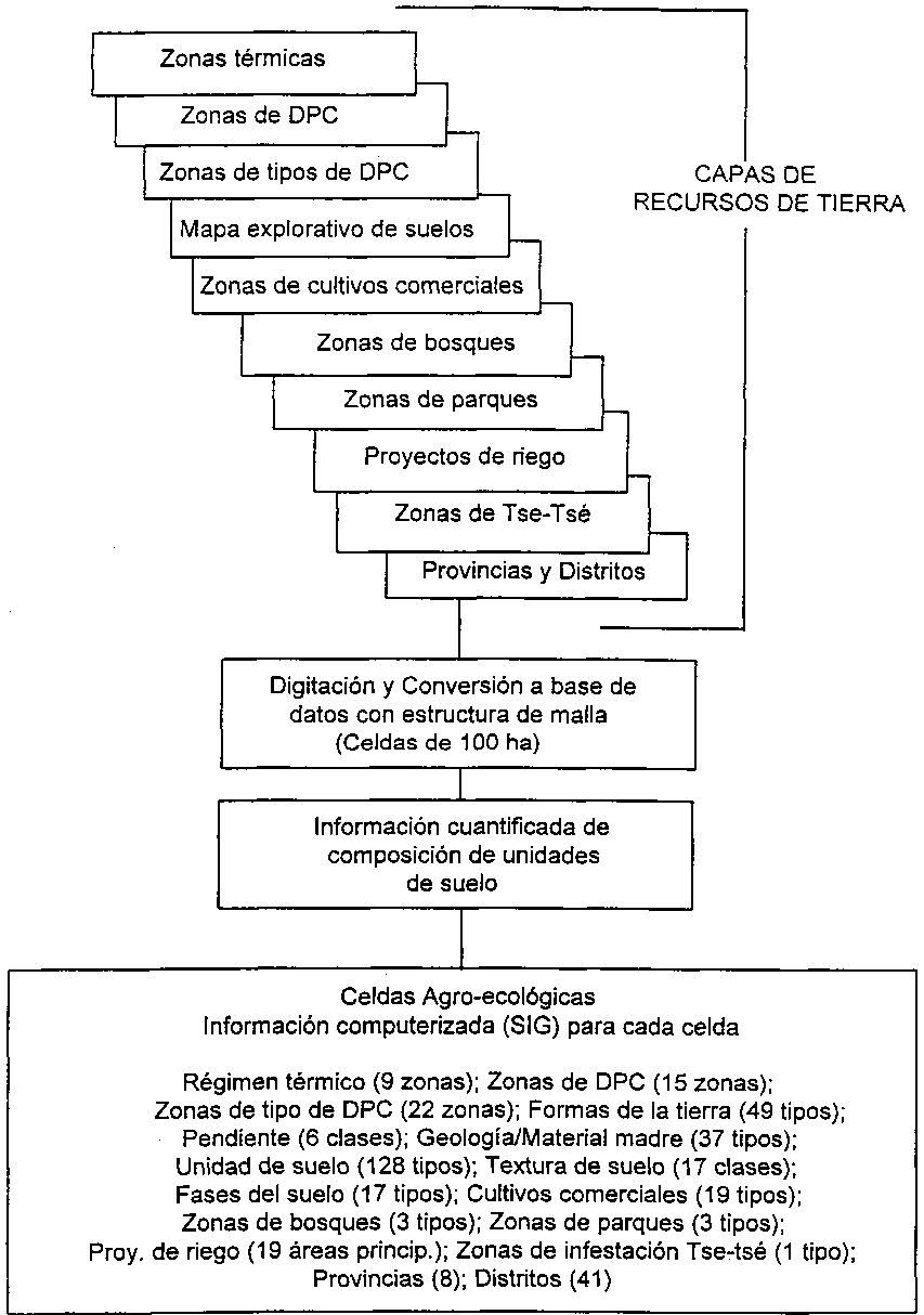 Elaborar un inventario de tierras es el resultado de superponer zonas térmicas, zonas DPC e inventarios de recursos de suelo. Información adicional sobre limites administrativos, uso de tierras y otros aspectos, tal como la incidencia de la mosca tse-tsé, puede ser también tenida en cuenta como se muestra en el ejemplo de la Figura 8. El resultado de este procedimiento es un mayor número de celdas agro-ecológicas, así por ejemplo, en el estudio de ZAE en Kenia fueron definidas aproximadamente 91,000 AECs. La Tabla 12 muestra un ejemplo de unidades cartográficas de recursos de tierra, unidades cartográficas de suelos y AECs, como se hace en un inventario de recursos de tierras.