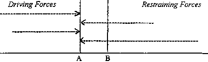 The force-field is a diagram of driving forces carrying you to the right ("progress"), and restraining forces pushing you to the left ("obstacles"). You are now at position A, and you want to be at Position B in the future.