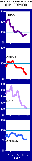 El último pronóstico de la FAO cifra la producción mundial de cereales de 1996 en 1 849 millones de toneladas (incluido el arroz elaborado), un 6,9 por ciento más que el bajo nivel de 1995. Si las condiciones son normales hasta la terminación de las cosechas de 1996, se pronostica que aumentará la producción mundial de trigo en un 6,4 por ciento a 581 millones de toneladas, la de cereales secundarios en un 9,4 por ciento a 875 millones de toneladas, y la de arroz en casi un 2 por ciento a 380 millones de toneladas (elaborado).