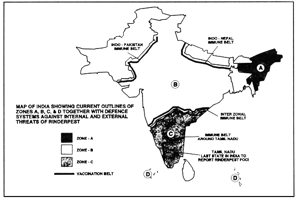 The approach for total eradication of rinderpest is based on the OIE strategy. On the basis of occurrence of rinderpest in the past decade in various parts of the country, India has been geographically delineated into four zones, namely Zone “A” consisting of States in the North Eastern parts of the country, Zone “B” consisting of Northern States in the country, Zone “C” consisting of Southern States and Zone “D” consisting of Union Territories of Andaman & Nicobar Islands, Lakshadweep and Minicoy Islands (vide map).