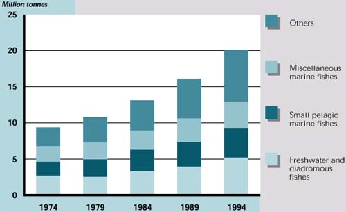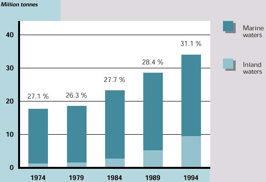 In 1994, after years of low catches, total marine catches in the region amounted to 2.2 million tonnes, almost reaching the 1988 level when landings were at their peak.