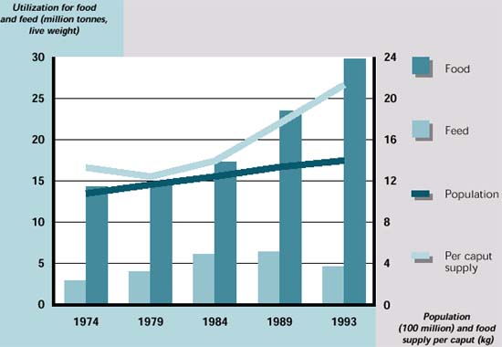 In China, the expected continuation of both rapid economic growth and expanding fish production will enable per caput consumption to increase further. Significant growth potential exists for freshwater aquaculture, principally through the rehabilitation of existing ponds, the utilization of water-logged areas and the vast surface areas of paddy fields. The growing number of hatcheries will enable this potential to be realized. Traditional marine capture fisheries do not appear to offer any significant growth potential. Coastal fish resources need to be carefully managed and future increases in landings will probably depend on distant-water fishing. However, strong economic growth is expected to generate enough purchasing power to satisfy any domestic demand-supply gap with imports.