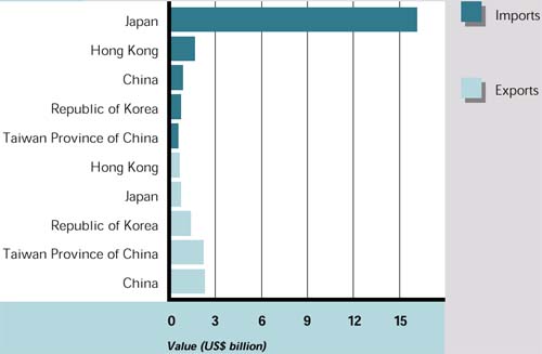 During the last decade, imports have expanded considerably and international trade in the region focuses on Japan, the worlds major importer of fish and fishery products. About one-third of the world fish trade goes to Japan (in value terms) and Japanese imports of fishery products increased fourfold over the decade to 1994. The main imports were shrimp and prawn, fresh and frozen tuna, crab and salmon (in value) and shrimp, prawn and tuna (in quantity).
