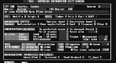 Figure 1. The species information screen in the REFORGEN information system. The figure displays all the parameters at present recorded on the utilization and conservation of forest tree species in the system illustrated through an example with Picea abies (Norway spruce) from Sweden. The upper part of the screen shows country and species name together with information on the origin of the data (Questionnaire on forest genetic resources, Country Report submitted for the 4th Intl. Tech. Conference on Plant Genetic Resources, or other information sources) in the field "Source". The section of the screen with the heading "Use" records if the species is planted (used in plantation programmes), managed in natural forests or both, together with information on main uses of the species. The "Conservation" section shows information on in situ conservation activities and ex situ conservation in the form of seed, pollen and tissues, plus information on ex situ conservation stands. The "Tree improvement" section holds numerical information on the genetic units tested in trials, held in archives and used in seed orchards. Finally, the section on reproductive material gives information on reproductive materials available in the form of seeds (source identified, selected seedstands, seed orchards or F1 hybrid). Additional information for any of the fields can be entered into the "Remarks" field, which has an indefinite size (memo field). Information on the organizations (e.g. Government departments, research organizations, private companies and non-governmental organizations) active in the field of utilization and conservation of forest genetic resources in the countries, constitute the other major part of the FAO information system. Information recorded comprise name of institution, address, telephone and fax numbers, e-mail address, names of contact persons of the organization, the type of organization, as well as the main activities of the organization (conservation of forest genetic resources and/or tree improvement). The species information and organizations information components store all the species and country related information in the system, whereas the remaining components of the system (the query component, the summary component, and the maintenance component) are used for interrogating and managing the system. Query component This component facilitates the development of queries on the species and organizations information held in the system. Search profiles are developed by selecting the parameters (database fields) to include in the search, together with the search criteria, from a screen list. Once the search is executed, the query can be examined on the screen, or sent to printer or file. Summary reports In addition to the query component which is used for the creation of specific and targeted reports, REFORGEN includes a number of pre-defined summary reports which give an overview or summary of a particular issue or activity. These reports generally fall into three categories: (i) country profiles, which in a table format give an quick overview of the main forest tree species in the country, and the genetic resources activities related to these species; (ii) species profiles which provide a list of countries where the species is of importance and the tree improvement and conservation activities related to the species; and (iii) activity profiles which for a selected activity (e.g. in situ conservation, ex situ conservation, tree improvement) for each species show the total number and names of countries having such activities. Library/maintenance component This component of the system includes the underlying and linking database files which are necessary for the system run, as well as facilities to update these library files with additional data. The most important library files are the "species library file" with taxonomic information (scientific names and authority, family names, synonyms etc.) and the "country library file" with country names and information on geographical and socio-economic groupings. The database files in the information system are linked through a system of codes, the most important, and frequent used, being the "species code" and the "country code", linking all species related and organizations related information stored under the heading of the code, to full country names and scientific names. This system facilitates easy data entry and up-date, and saves storage space. INFORMATION SOURCES FOR THE SYSTEM The core data in the FAO world-wide information system on forest genetic resources has been provided by the countries through replies to a questionnaire on forest genetic resources which was sent out in March 1993 to Heads of National Forest Services. The covering letter to the questionnaire requests Heads of National Forest Services to contact and consult all concerned institutions and agencies in their countries, including other governmental bodies, research institutes, universities, the private sector and NGO's. To ensure as complete a response as possible, FAO's Forestry Department has, furthermore, dispatched copies of the questionnaire to individual contacts in a range of countries, drawing their attention to the questionnaire, and asking them to please input data to the national-level survey, possible sending a copy of such inputs also directly to FAO to ensure that information provided is not inadvertently overlooked, or lost. The information provided through replies to the questionnaire has been complemented by information on the conservation and utilization of forest genetic resources from Country Reports submitted by countries in the preparatory process of the Fourth International Technical Conference on the Conservation and Utilization of Plant Genetic Resources held in Leipzig, Germany, 17-23 June 1996 (see elsewhere in this issue of Forest Genetic Resources). The Country Reports document the status of plant genetic resources in each country, fo