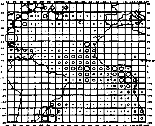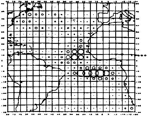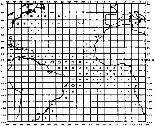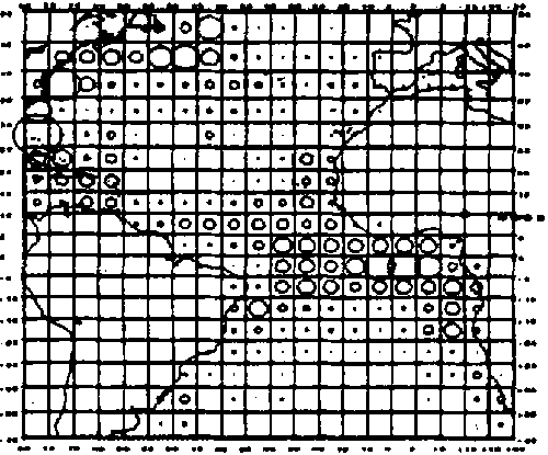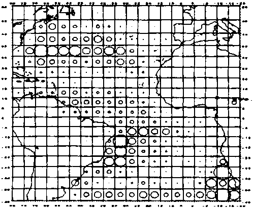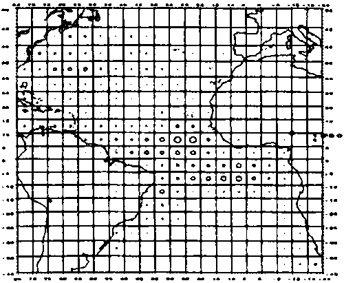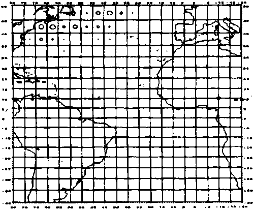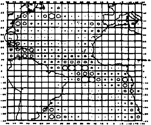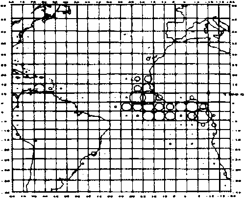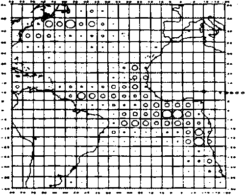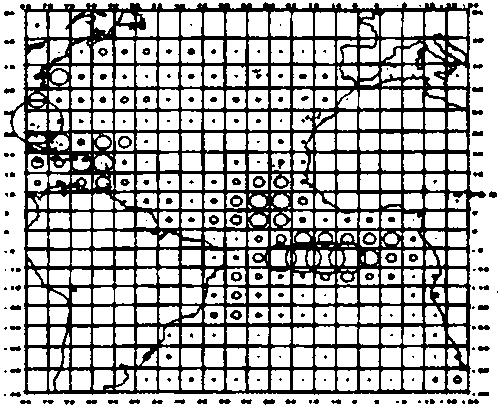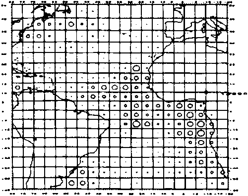 Figure 2. Geographical distribution of bluefin tuna catches by surface fisheries, average for 1983-93.