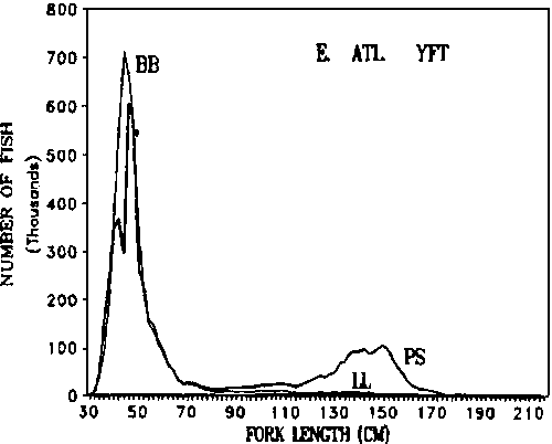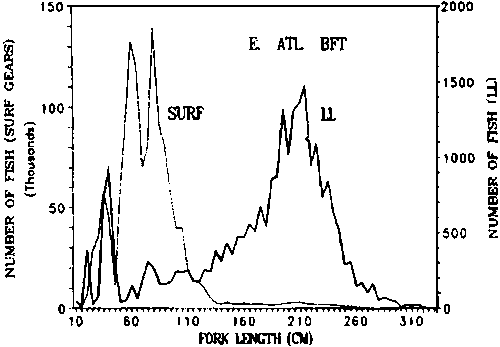 On the other hand, fishing by various surface gears for the same age groups also occurs almost in the same area and at the same time (e.g., troll and baitboat for age 2-4). The situation is further complicated by many of these gears catching tunas other than bluefin (e.g., Spanish trollers catch albacore as the target species; Asian longliners also target bigeye and most of the other tunas and Spanish longliners target swordfish).