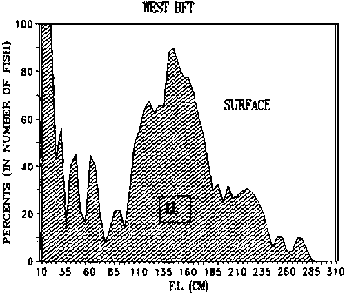 Figure 13. Percentage of longline and surface bluefin catches in each size classe, in the east and west Atlantic, average for 1985-93.