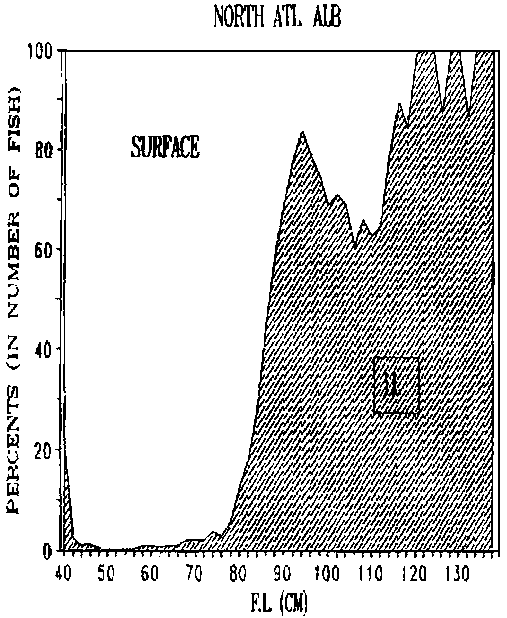 The northern stock is harvested by surface gears and longline, while the catch by the latter has been much less important. The fishing area does not overlap significantly between these two types of gears due to the fact that the surface gears catch mostly young fish while the longline catches spawning stock (or mature fish). The surface gears consist of troll (Spain and France), baitboat (Spain, France), drift gillnet (France, Ireland and the UK) and mid-water trawl (France), and the areas of their operations are almost identical. In recent years, there has been significant conflict between the countries using drift gillnets and those which prohibit the use of this gear, since it seems that the drift gillnet is a more efficient fishing method (see Section 3.3 for explanation). Yield-per-recruit studies suggest that some increase in yield could be expected if the size of the first capture is increased.