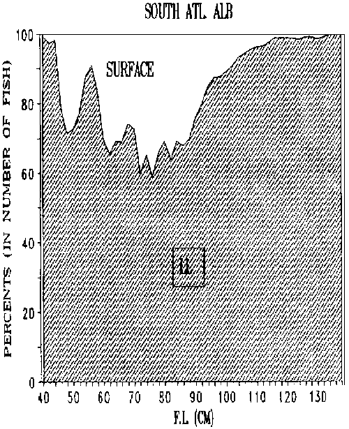Figure 17. Percentage of longline and surface albacore catches in each size classe, in the north and south Atlantic, average for 1985-93.