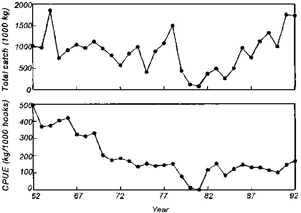 It is important to note that low CPUEs occurred when catches were low and numbers of fishing trips (presumably representing fishing effort) were low (Boggs and He, NMFS, Honolulu, unpubl. data). Fishermen may fish more when CPUE is higher than normal, and fish less when CPUE is lower than normal. The latter implies that local catches do not affect CPUE because fishing effort is reduced when CPUE declines, tending to prevent depletion of local abundance. A further analysis of fishing effort would be useful.