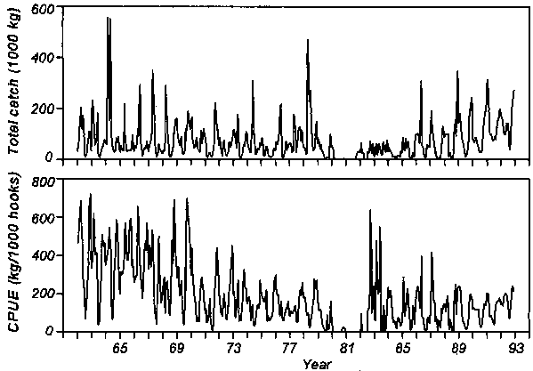 At the annual time scale, total catches of bigeye tuna by all gears fluctuated around 1,000 mt from 1962 to late 1970s (Figure 1). Total catches then dramatically declined from 1,504 mt in 1978 to 82 mt in 1981. Beginning in 1982, total catches steadily increased to around 1,700 mt in the early 1990s. The annual longline CPUE of bigeye tuna, however, showed a different pattern. CPUEs were the highest in the 1960s, fluctuating around 350 kg per 1,000 hooks, and then decreased to around 150 kg per 1,000 hooks in 1970s (Figure 1). Corresponding to the lowest total catch (all gears) in 1981, longline CPUE was zero in 1981. These longline data may reflect an unresolved under-reporting problem. From 1982 to 1992, CPUEs fluctuated around 120 kg per 1,000 hooks.