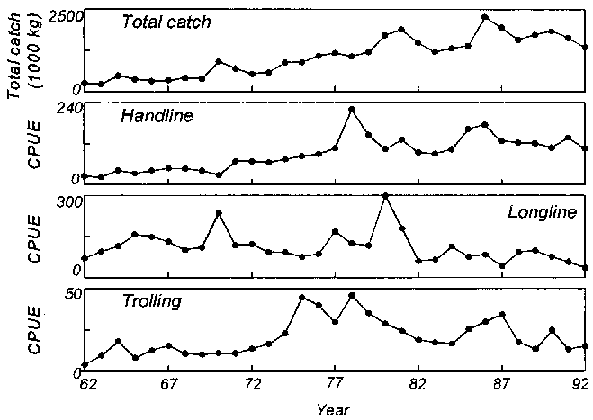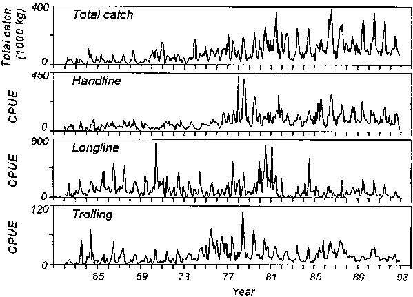 At the annual time scale, total catches of yellowfin tuna steadily increased from around 300 mt in the early 1960s to around 1,600 mt in the early 1990s with a peak of 2,265 mt in 1986 (Figure 3). The CPUE for handline gear showed an increasing trend similar to the total catch but with a peak in 1978 (Figure 3). The CPUE for both longline and trolling gears, however, showed different patterns from that of handline gear (Figure 3). The CPUE for longline gear fluctuated around 100 kg per 1,000 hooks prior to 1980 and fluctuated around 70 kg per 1,000 hooks after 1982. Longline CPUE had the highest CPUE values in 1970 and 1980. The CPUE for trolling gears was low from the 1960s to the early 1970s, high in the mid 1970s with a peak in 1978, and then deceased thereafter (Figure 3). The CPUE for trolling gear in the most recent years (1987 to 1992) was low and similar to the CPUE from the 1960s to the early 1970s.