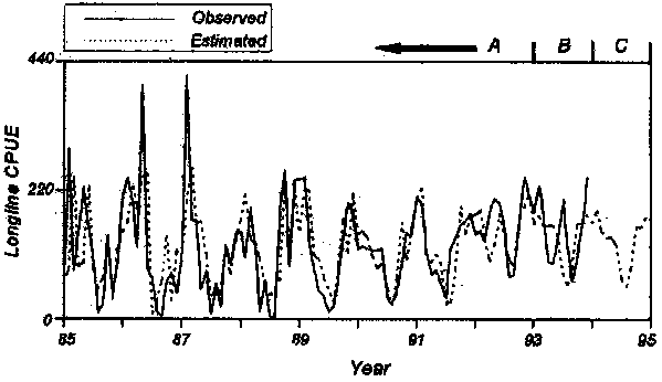 The time series of estimated CPUE (1985-92), CPUE forecasted by the transfer model (1993-94), observed CPUE for bigeye tuna caught by longline (1985 to 1992), and preliminary data for 1993 (Figure 5) showed that the estimated CPUE matched well with the observed CPUE, especially in terms of seasonal changes. In other words, the model was good at estimating when the peaks of CPUE should occur. In 1993, the CPUE forecasted using the total catch data showed similar seasonal changes, but failed to estimate an atypical peak in CPUE observed from June to August (Section B, Figure 5). The CPUE forecasted for 1994 without having total catch data showed the same seasonal changes as were estimated for 1993.