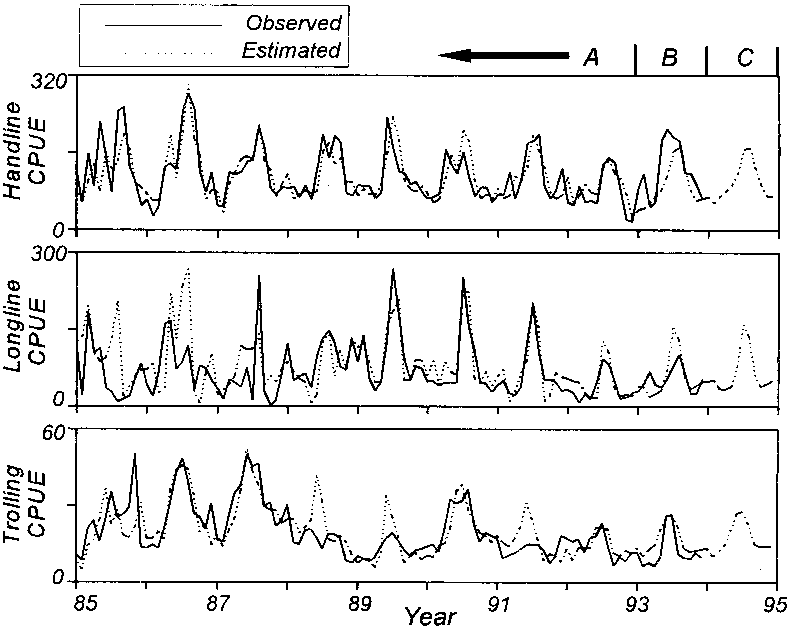 Comparison of the time series of estimated and forecasted CPUE from the transfer models with the observed CPUE for yellowfin tuna caught by three gears (handline, longline, and trolling, Figure 6) generally showed that the estimates matched fairly well with the observed CPUE, especially for handline gear (Section A, Figure 6). Similar to the longline CPUE model for bigeye tuna, the three yellowfin tuna models estimated the seasonal changes well. Among the three gears, the estimated CPUE for handline matched best with the observed CPUE. The 1993-94 forecasted CPUE of three gears showed similar seasonal changes.