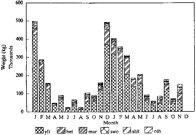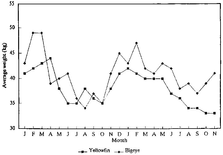 Table 1 shows the species composition of sampled landings by month for 1992 and 1993. It is clear that yellowfin tuna (Figure 2) always made up the highest proportion of the landings; bigeye were landed in smaller amounts. Marlins (Makaira indica, M. mazara and Tetrapturus audax), swordfish (Xiphias gladius), sailfish (Istiophorus platypterus), skipjack tuna (Katsuwonus pelamis), wahoo (Acanthocybium solandri), barracudas (Sphyraena), and a few species of sharks were also landed.