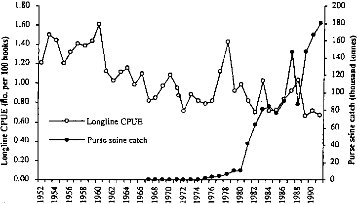 The first method was applied to time-series of fisheries statistics, building on results from earlier studies (Suzuki, 1994). Using Japanese longline data, catch-per-unit of effort (CPUE) of yellowfin tuna were computed and time-series trends analysed. The CPUE for the region as a whole indicated a sharp declining trend between 1959 and 1973 followed by a significant upward trend until 1979 before declining again to a low level (Figure 3). The sharp decline in the 1960s occurred well before the build-up of the purse seine fishery and associated surface catches (Figure 3). The more recent decline, on the other hand, occurred during the period of expansion of the surface fishery as well as during the period when the Japanese longline fleet switched to targeting bigeye tuna (Suzuki et al. 1977). Recent analysis that corrects for this switch in target species produces a stable CPUE trend since 1989 in the Japanese longline CPUE (Miyabe, 1994). Thus, analysis of CPUE data has not demonstrated a region-wide interaction between the two gears for yellowfin tuna.