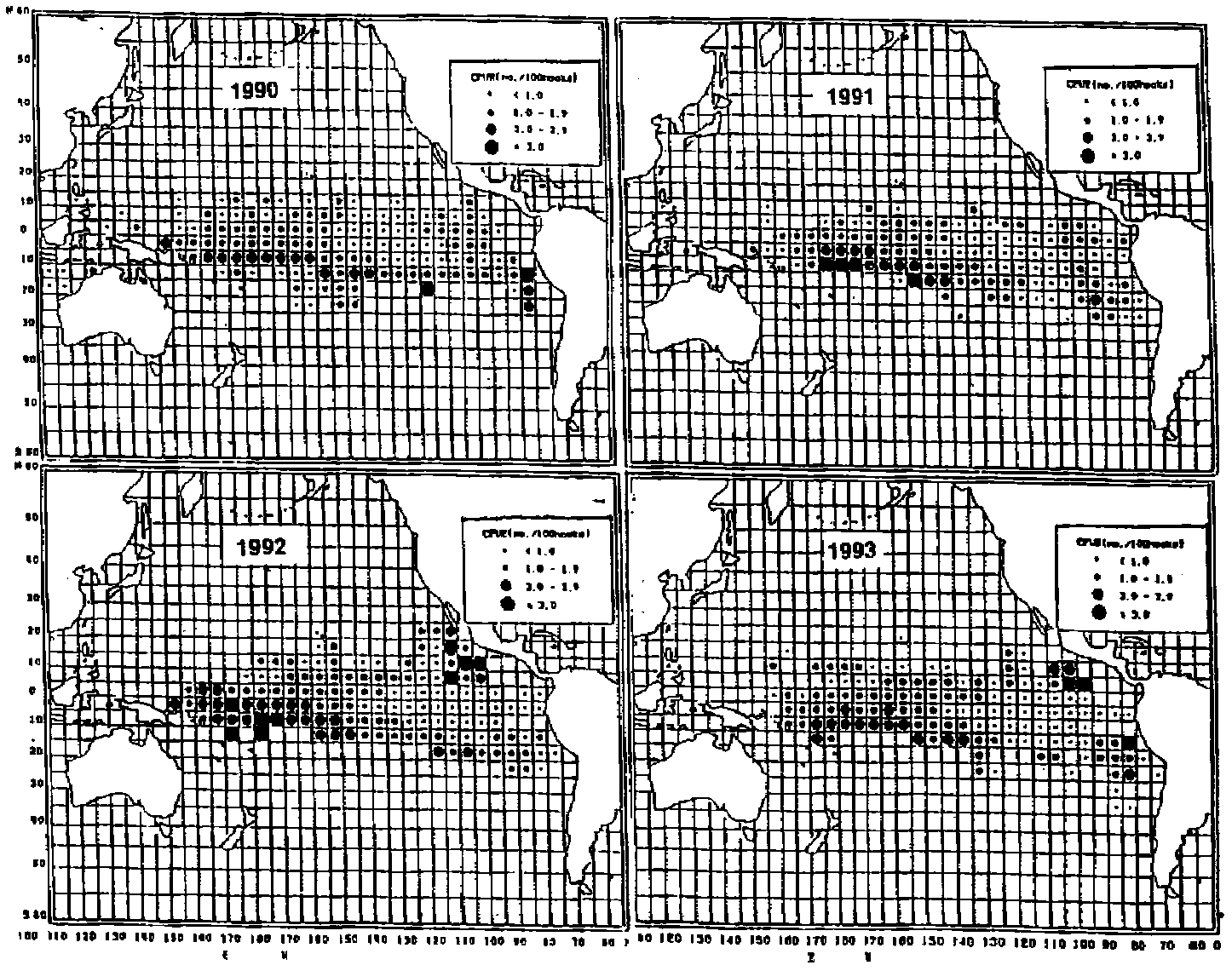 Table 1. Number of vessels, catch, and CPUE of Korean longline fishery in the Pacific Ocean during 1990-93.