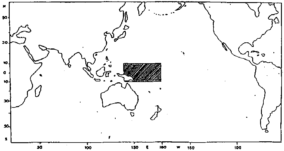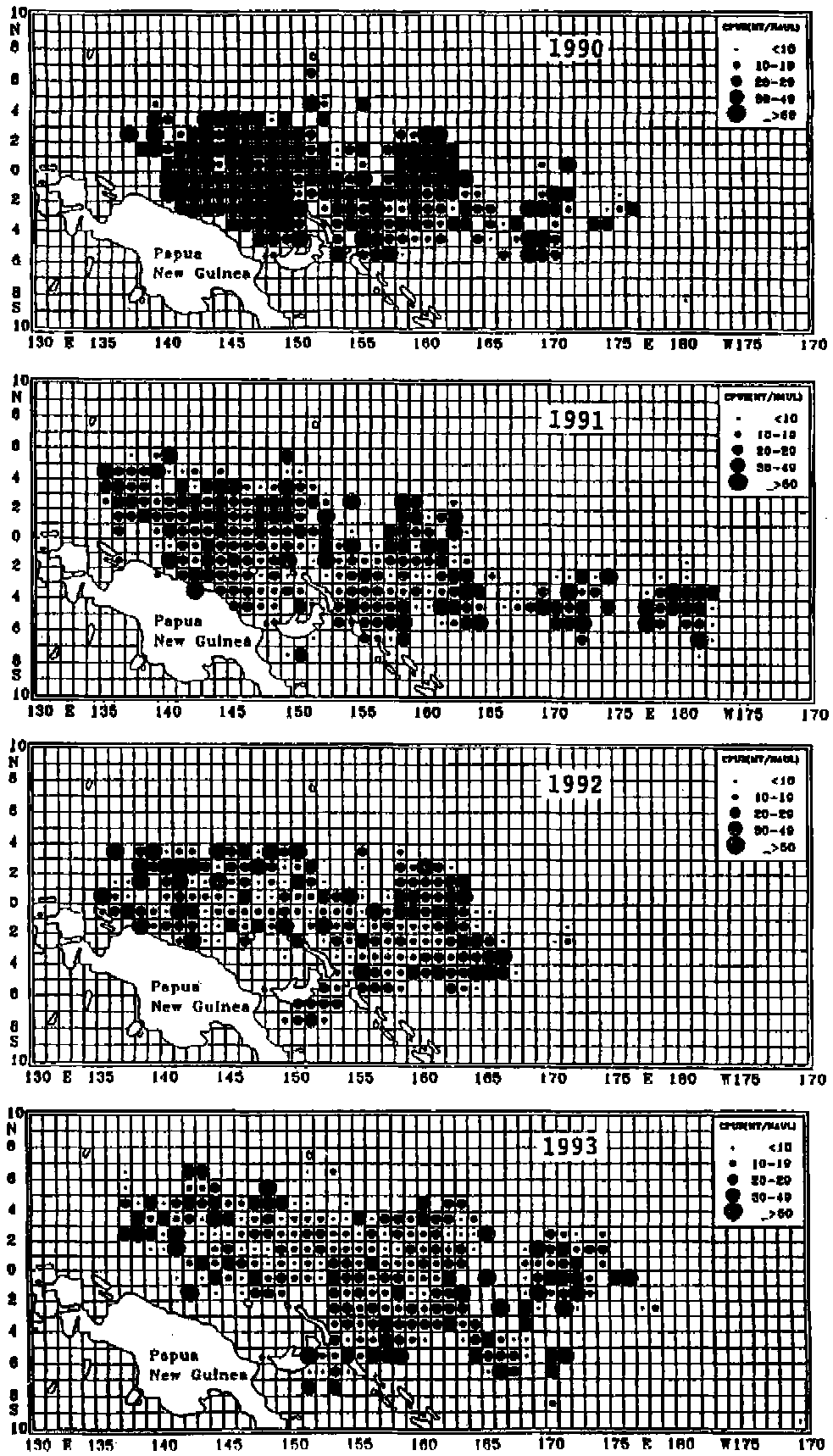 Fishing area by purse seine extended westward in recent years compared to late 1980s (Figure 2). In the late 1980s the range of purse seine fishing operation was between 138-166ºE, while in 1990-93 it was between 135ºE-175ºW.