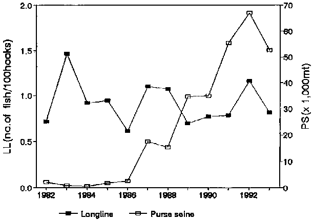 Catches by the Korean tuna vessels operating in the Pacific have increased year by year and exceeded 100,000 mt for the first time in 1987 (Park et al., 1990). The 1987 tuna fleet consisted of 138 longliners and 20 purse seiners. During 1990-92, the catch by the Korean tuna fleet amounted to over 200,000 mt annually (Tables 1 and 2); however, in 1993 the catch decreased significantly to about 160,000 mt. This decrease was largely attributed to the decrease in catch by purse seiners (Table 2) rather than the decrease in catch by longliners of relatively small fleet size compared to previous year. Currently about 150 longliners and 30 purse seiners are engaged in tuna fishing in the Pacific.