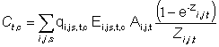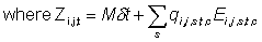 where C is the catch at time t by vessels of category c, defined by flag and t,c vessel characteristics; q is the catchability coefficient; M is the instantaneous natural mortality rate; i and j are the latitude and longitude of the 2½° areas; s is the fishing mode (1-3); E is the effort in boat days; and dt is the time increment - one "week," or a fifth of a month. An annual rate of 0.8 was assumed for M; q was obtained from the work of Punsly and Deriso (1991), briefly described by Mullen (1996). Monthly effort was available from compilations of logbook records made by the IATTC; these values were divided by five to give weekly values. The catchability coefficients were in general, specific to the particular areas and months, but one run was made in which the mean value over the seven years was used as the catchability for a given cohort, area and month.