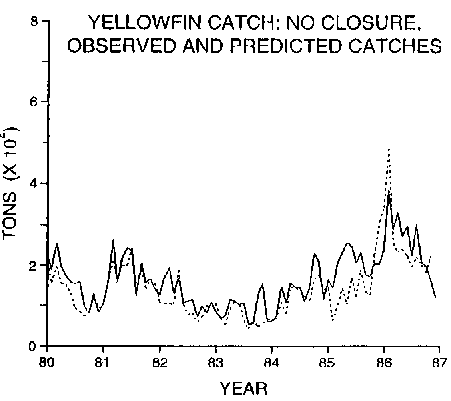 The questions to be answered are: what would have happened if none of the vessels that comprise the international fleet had operated in the dolphin fishing mode; if no log fishing occurred; or if fishing involved only the school-fishing mode? These scenarios are easily set by fixing the catchability coefficient for any given mode(s) of fishing at zero. The predictions of the catches of yellowfin for these three scenarios are given in Figures 3A-5A with the predictions given by the effort allocation for unrestricted fishing. Figures 3B-5B show equivalent predictions for the sum of yellowfin and skipjack.