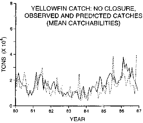 All subsequent runs of the model used the catchability coefficients that were used in the production of Figure 1A. The next stage was to compare the predicted catches using the effort distribution as determined by Anganuzzi's effort allocation program. This comparison is available in Figure 2 for yellowfin (Figure 2A) and for yellowfin and skipjack combined (Figure 2B). The solid lines of Figure 2 represent the catches predicted using the effort allocation program (Anganuzzi, 1996). Thus, the model predicts a similar time-series of catches when using Anganuzzi's (1996) program for allocating effort as it does when using the recorded distribution. The series predicted using the effort allocation program will henceforth be used as a standard of comparison when investigating the effects of curtailing the fishery.