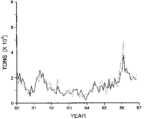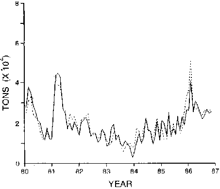 Figure 1. Observed catches (solid line; total catch = 1,337,266 tons) compared to those calculated from the recorded distribution of effort (dotted lines), using B) monthly mean values of catchability (total catch = 1,222,957 tons).