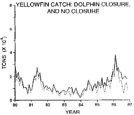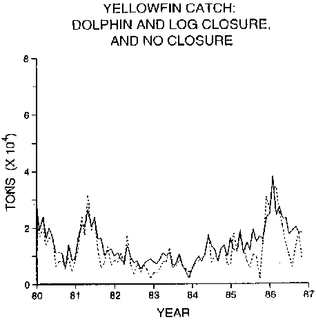 If fishermen had forgone both log and dolphin fishing, the catches of yellowfin would have declined immediately. Catches of yellowfin under this scenario only rarely equal or surpass those that were predicted with the observed fishing modes. Under this scenario, there is no compensation for reduced catches of yellowfin by increased catches of skipjack.
