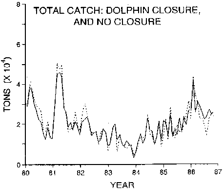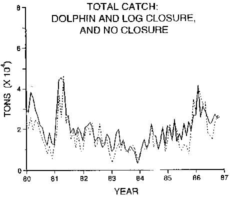 A discussion of the effects of curtailing modes of fishing in a particular year cannot be divorced from the peculiarities of that year. Some years are bad for fishing logs, in those years little is sacrificed if logs are passed by. In years that are very good for fishing logs, less will be lost if boats do not fish dolphins. The effects will also vary among categories of vessel. Vessels that cannot fish dolphins may suffer from increased competition if other boats switch from that mode of operation.