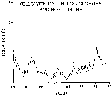 Log and school fishing were considered a single mode by Punsly et al. (1994). The effects of switching from log fishing suggested by this body of work are at first surprising, but easily explained. It was anticipated that catches of yellowfin would initially decline, but would recover after a delay, so that the overall effect on yellowfin would be positive. The model predicts instead that catches are immediately enhanced, and that the overall effect on catches is positive. However, when skipjack are added, the total catches do show an initial decline, followed by a recovery to roughly the catches predicted without changing fishing mode. Log fishing generally yields more skipjack, and there was a lot of log fishing in 1980, 1981 and 1982; catches of skipjack would have declined substantially in those years without log fishing. Effort is redirected to school and dolphin fishing, for which the catch of yellowfin is higher, that is why there is an immediate increase in the catch of yellowfin. During 1984-86, there was little log fishing, so little effort to redistribute from that mode. If the population had been more heavily exploited during the period considered then the recorded catches of yellowfin might indeed have declined more. Then there would have been more scope for improving the yield per recruit.