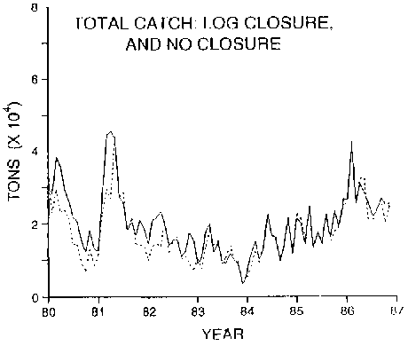 The case when no boats fished logs is almost the opposite of that when they eschewed dolphin fishing: catches of yellowfin would have increased for most categories, but the overall benefit would be reduced due to lower harvest of skipjack. For two categories, K and L, there would have been a marked decline in the total catch during 1980-83 when the incidence of log fishing was high.