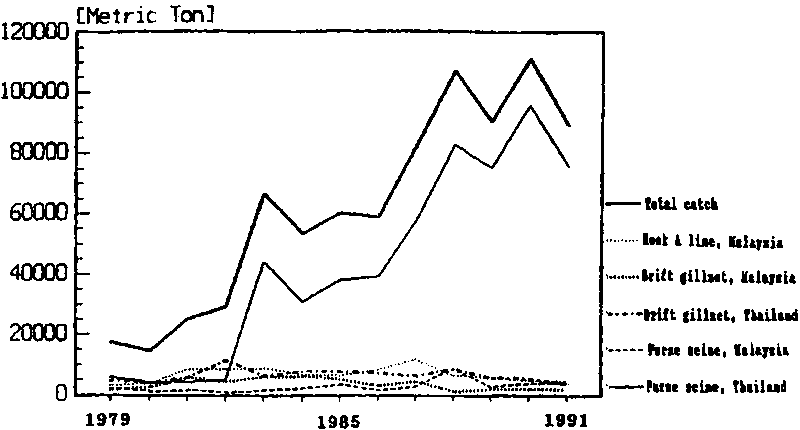 The western part of the South China Sea (Gulf of Thailand and coastal areas off East Peninsular Malaysia) has been known for its abundance of longtail tuna and this species is one of the most important commercial species in this area. Although tagging experiments involving small tunas (kawakawa, Euthynnus affinis, and longtail tuna) have been carried out in waters of the east coast of Peninsular Malaysia since 1990, the recaptures of longtail tuna have not been sufficiently large enough to estimate movements and migration patterns (Raja Bidin, 1990). However, based on the relative differences in catch per unit effort (CPUE) of Thai fisheries and Malaysian fisheries in the area, the main concentration of longtail tuna appears to be in the Gulf of Thailand.