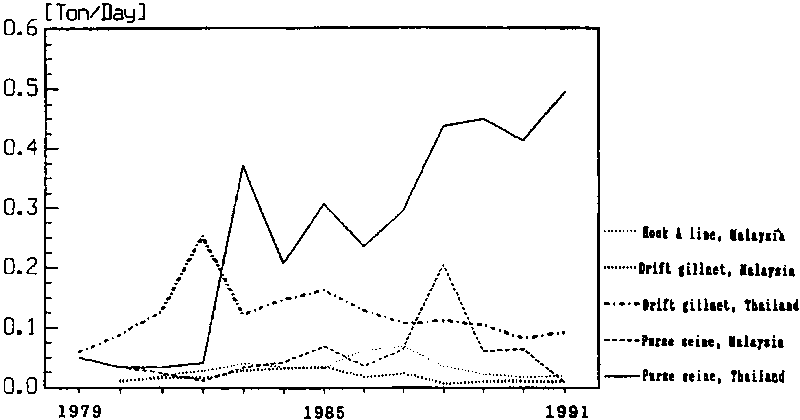 Intensive exploitation of longtail tuna by the purse seine fishery in the western part of the South China Sea (especially in the Gulf of Thailand) indicates a possible interaction between the purse seine fishery and other fisheries. This view is suggested by recent decreasing trends in CPUE in all of the other fisheries targeting longtail tuna in the area.