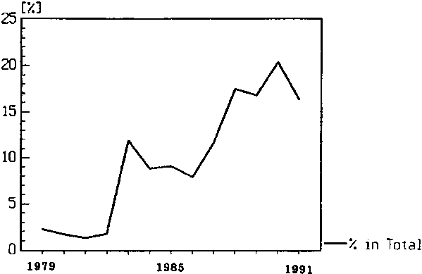 Figure 5. Change in proportion of longtail tuna in the total Thai purse seine catch, 1979-91.