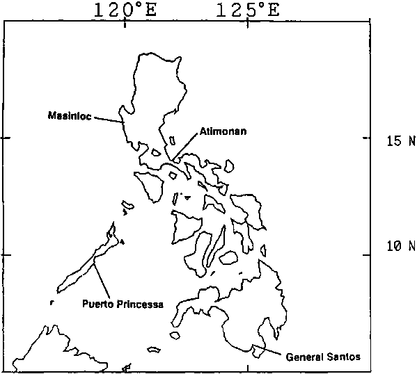 From April 1993 to February 1994, four field samplings were made in four major vessel off-loading sites in the Philippines. The first one took place in April and three more samplings were made in July, September and February. The sampling sites were General Santos in Mindanao (Celebes Sea), Puerto Princessa In Palawan (Sulu Sea), Masinloc in Luzon (South China Sea) and Atimonan in Luzon (Pacific). These locations are shown in Figure 1. These sampling sites were selected to consider the magnitude and modes of fishing operations, and to cover as wide an area as possible.