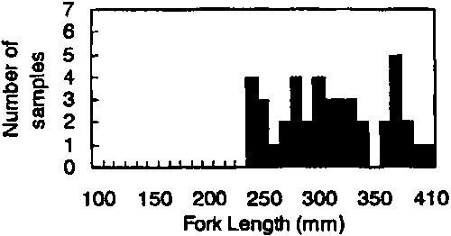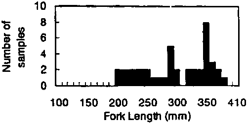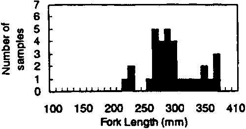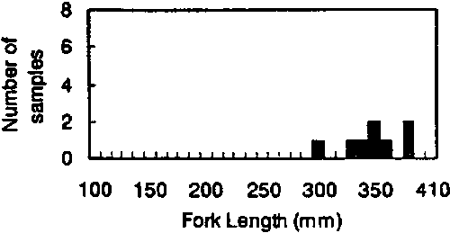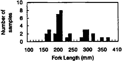 The sampling scheme was to collect yellowfin and bigeye tunas of 150-350 mm FL, randomly selecting five fish in every 50 mm length interval, at each sampling site and time. Accordingly, the total number of fish sampled would be 320 fishes for each sampling. In this way, it was expected that there would be enough fish to estimate the ratio of species misidentifications by samplers, if it existed. In addition, the sample should be large enough to characterise any changes in morphological characters by size and by season.