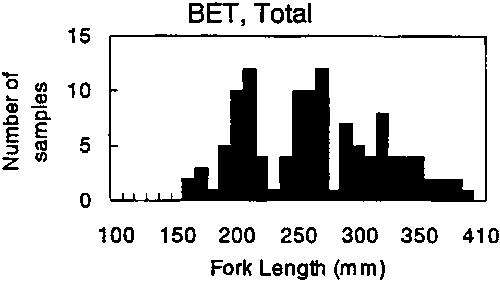 YFT total = 395, BET total = 118, Grand total = 513The length frequency distributions of sampled fish are shown in Figures 2-6, by sampling site and season. Fish smaller than 200 mm FL are relatively scarce. Reflecting the sampling scheme, samples are scattered more or less evenly between 200 and 400 mm. When the desired sampling scheme could not be met due to shortage of tuna catch or absence of required fish size, fish from other length classes were sampled to reach the expected sample number, and in some cases larger-sized fish up to 400 mm were included.