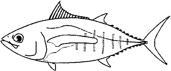 Species identification using external characters such as marks and bands (Figure 7) on the lateral part of body, the diameter of eye orbit, length of pectoral fin and body depth seems relatively easy for a well-trained sampler when fish are fresh, but it is difficult to separate bigeye from yellowfin when those characters are not clear after storage on ice or when the fish is damaged. Skipjack tuna is simple to identify because it has clear banding on the side of the body and a rather elongated body. Bigeye and yellowfin are easily separated from skipjack, for fish bigger than 200 mm, since the former have elongated pectoral fins.