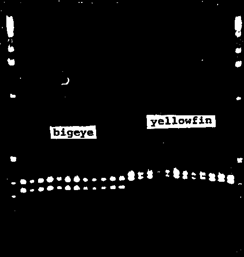 Figure 9. Restriction profile of mitochondrial ATPase gene fragments digested by Rsa I endonuclease, showing clear differences between yellowfin and bigeye tunas.