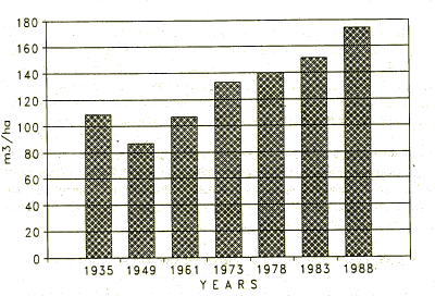 The mean volume of the mature stands in the year 1988 was 258 m3. The changes in the mean volume during this century demonstrates also changes in forest management. The trend of the average volume of all stands as well as the average volume of mature stands are ascending (Graph. 2). Also, as is evident from the Figure, the only case of a decrease in stand volumes was after the Second World War. Latvia's forest resources are greater now than in the first half of the century.