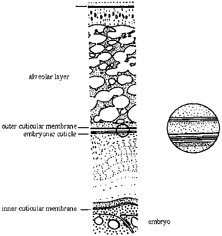 · embryonic cuticle: a transparent and highly elastic layer separated from the embryo by the inner cuticular membrane (develops into the hatching membrane during hatching incubation).
